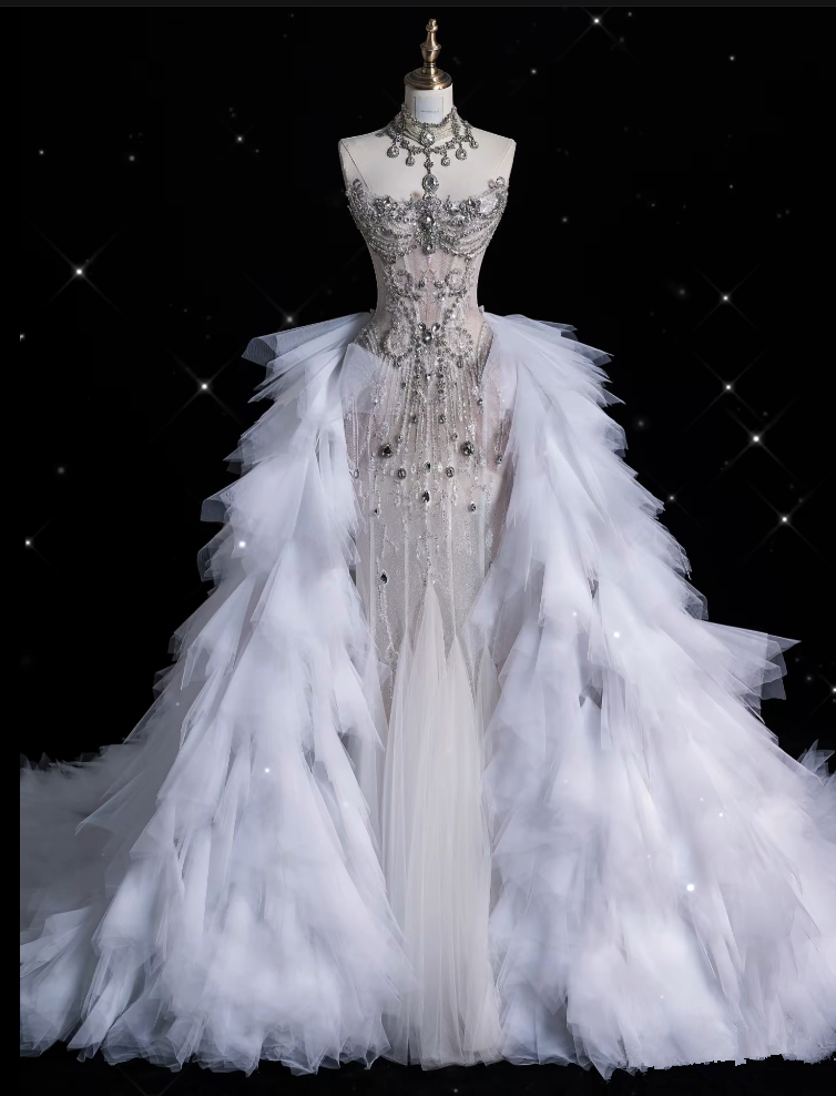 Mermaid Strapless Tulle With Silver Beads Long Wedding Dresses Brides Dress SD1864